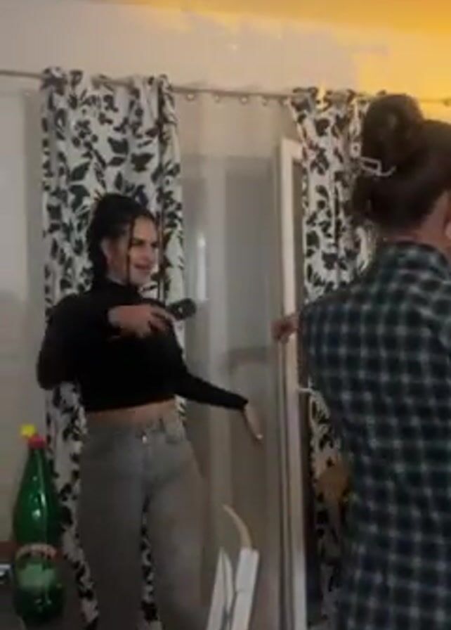 Several individuals are seen dancing in what appears to be a home setting. A woman with long, dark hair pulled into a bun is wearing a plaid shirt, while another woman is wearing a black turtleneck crop top and gray pants. Other individuals join in, including a man in a brown shirt. There are floral patterned curtains hanging in the background, and a bottle of liquid is visible on a table in the foreground. The room is illuminated with overhead lighting and possibly a lamp. A star-shaped balloon is also present. The people appear to be enjoying themselves.