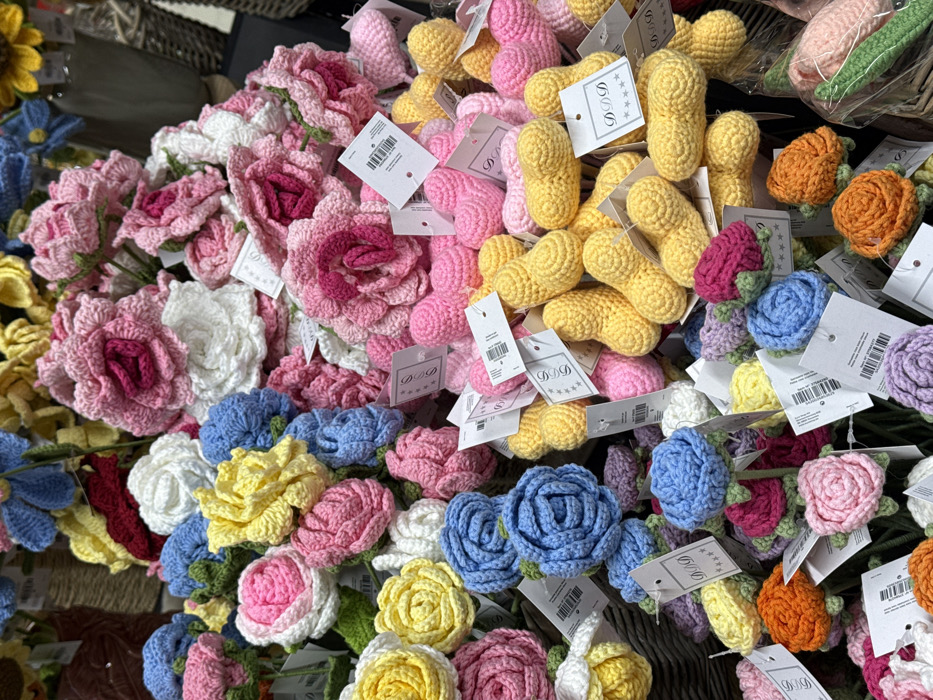 The image displays a dense, close-up perspective of numerous handmade crocheted items, predominantly flowers, arranged in what appears to be a retail or market setting