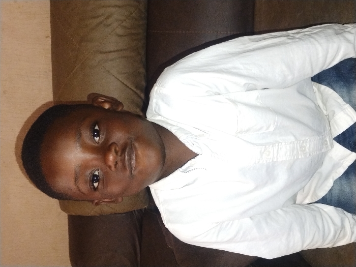 The image displays a young, dark-skinned male child, estimated to be between 5 and 8 years old, sitting and looking directly into the camera. He has short, dark hair and a neutral facial expression with a slight, subtle smile. The child is wearing a white, long-sleeved collared button-down shirt with a single left chest pocket, and blue denim jeans visible from the waist down. The shirt appears slightly creased. Behind the child, a brown upholstered surface, likely a cushion or backrest of a sofa, is visible, featuring subtle stitched patterns. Above this, a plain, light beige or tan-colored wall with a minor texture forms the upper background. The scene is indoors. No specific visual elements are present in the image to confirm the location as New Stadium, Nigeria.