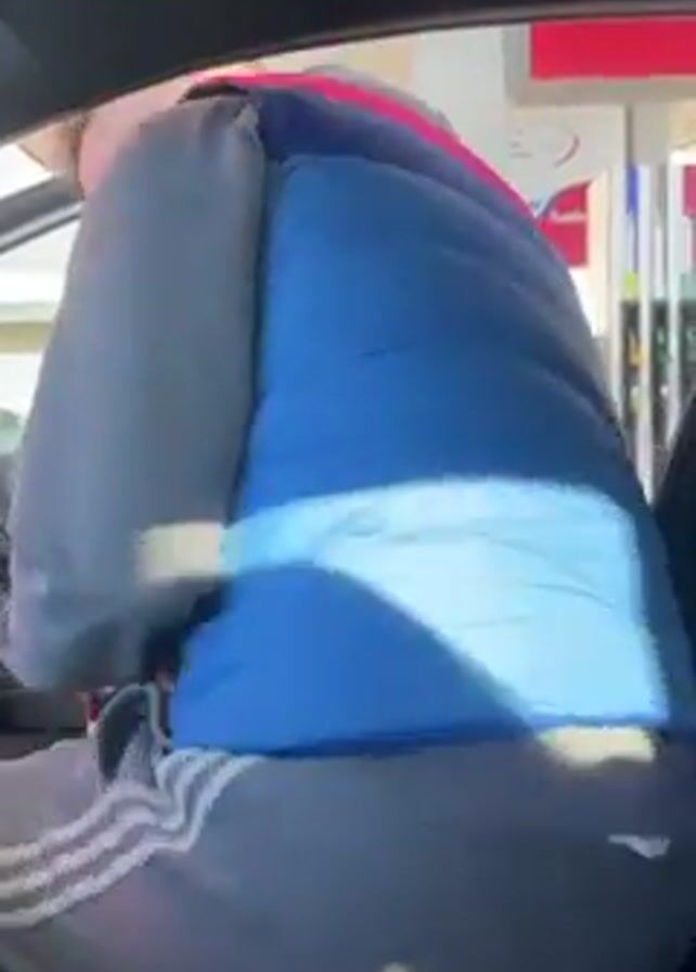 A man wearing a blue vest and grey sweatpants enters the driver's seat of a car parked at a gas station