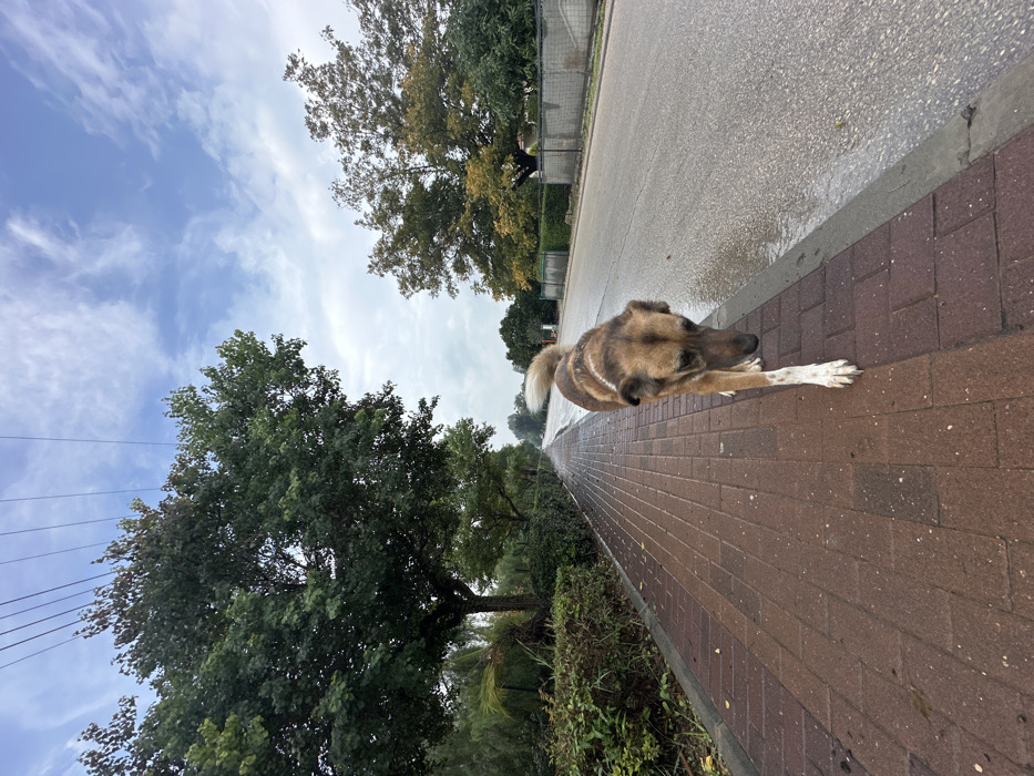 The image captures an outdoor scene in Beit Yitshak Sha'ar Hefer, Israel, on an overcast day. A medium-sized dog with tan, brown, and white fur, and white front legs, walks forward towards the viewer along the right edge of a wet, reddish-brown brick sidewalk. Its head is lowered. To the dog's right, a wet asphalt road with visible puddles extends into the distance. To the left of the sidewalk, a manicured green hedge runs parallel, backed by a line of mature trees with dense green foliage. Power lines are visible stretching across the upper left sky. On the opposite side of the wet road, more trees, some with yellowish leaves, line a property, partially obscured by a low wall or fence. The sky is largely cloudy with patches of blue and wispy white clouds.