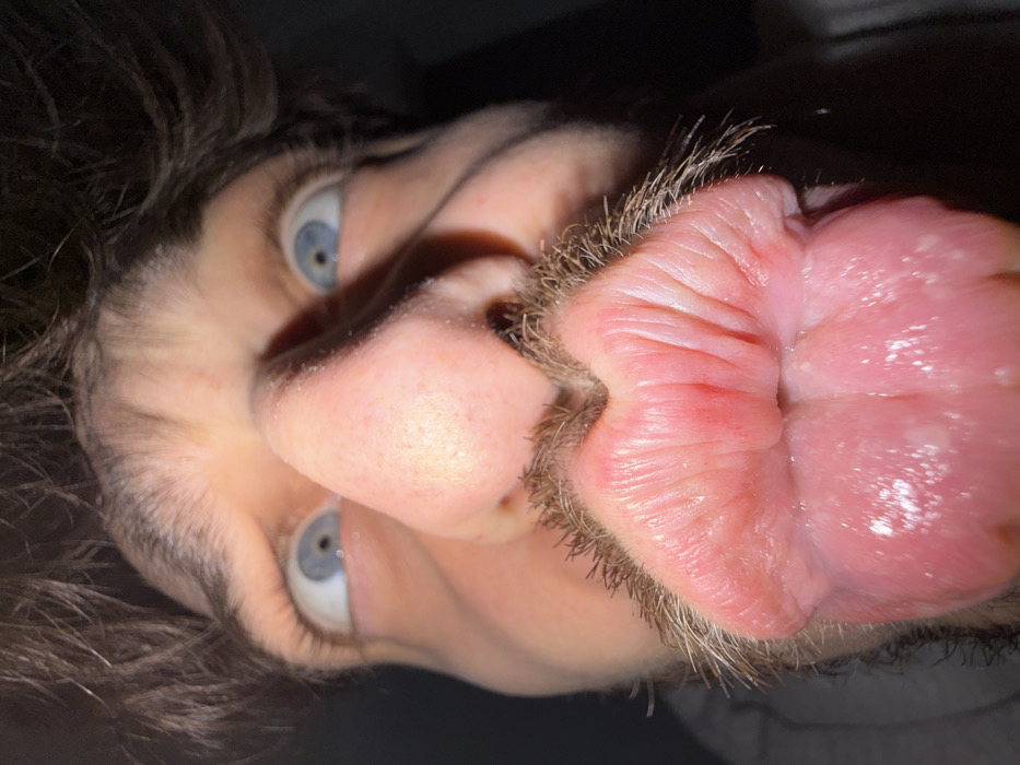 The image presents an extreme close-up portrait of an adult male's face, occupying the entire frame. The subject has fair skin, dark brown disheveled hair visible at the top, and light blue eyes that are wide open and gazing upwards. A prominent nose is centrally positioned. Dark stubble or beard growth is visible around the mouth, which is pursed into an exaggerated 'fish-face' or kissing expression, appearing enlarged and moist. The cheeks are visibly drawn inward. The background is uniformly dark and featureless, providing no environmental context. No specific geographical location, including Strasbourg, France, is discernible within the image.