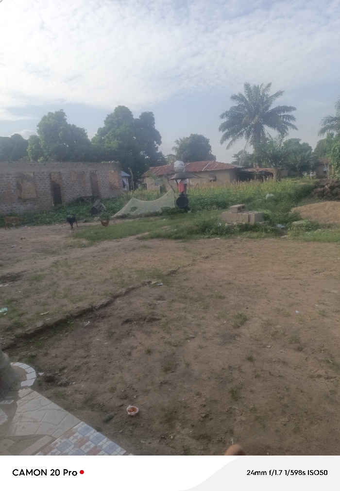 The image depicts an outdoor scene within a residential or semi-rural area of Makurdi, Nigeria, under a partly cloudy sky
