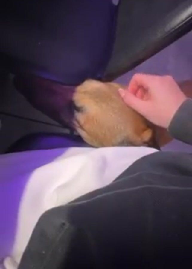 A person is sitting with a dog lying on their lap