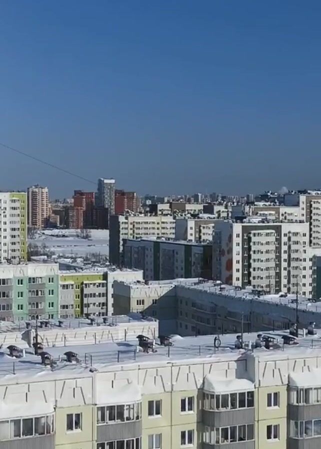 daytime view of a city skyline in winter. Several apartment buildings are covered in snow, with clear blue skies above. The buildings are mostly white and gray, with some having colorful accents. The foreground building has visible balconies, and some structures on the roof appear to be covered in snow. The cityscape stretches into the distance, with various buildings of different heights and colors. The scene is bright and clear, highlighting the wintery landscape.