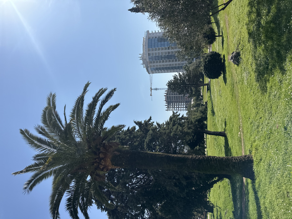The image displays a park environment in Budva, Montenegro, under a clear blue sky with a prominent sun flare in the upper right quadrant. A large palm tree with a rough, brown trunk and extensive green fronds occupies the left side of the frame, extending beyond the top edge. Behind the palm tree and extending into the midground are various other trees, including dense, dark green coniferous trees and lighter green broadleaf trees, some appearing ornamental. The ground consists of bright green grass dotted with small white flowers, exhibiting natural undulations and minor depressions. In the central-right midground, a dark green, spherical shrub is present, with a single rock resting on the grass nearby. The background features two high-rise buildings. On the right, a modern, multi-story building with a light-colored, curved facade and numerous windows appears largely complete, topped with structural elements and antennae. To its left, a multi-story building under construction is visible, presenting a concrete skeleton framework, with a large yellow tower crane positioned immediately behind it. No individuals or specific activities are depicted in the scene.
