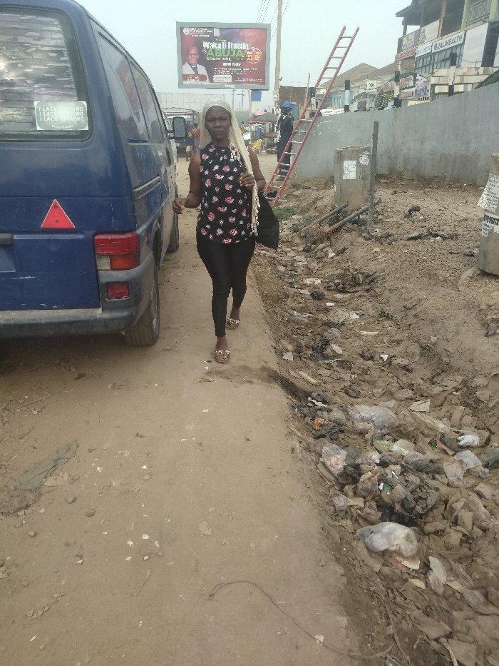 A woman wearing a floral blouse, black pants, and a white headscarf is walking on a dirt road in the city of Way, Nigeria. The road is dusty and there is a pile of trash on the side of the road. A blue van is parked on the side of the road. There is a sign in the background with an image of a man in a suit. The sign advertises an event called "Wake n' Praise." There is a ladder leaning against a building in the background.