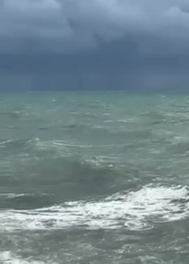 turbulent sea under a stormy sky. The water is a greenish-grey color with white foam visible on the surface due to the waves. The sky is overcast with dark, heavy clouds. In the foreground, there is a blurred out fence. The camera appears stationary.