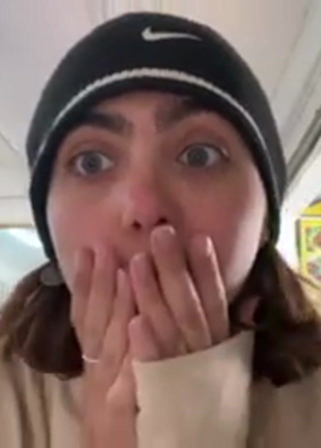 woman wearing a black Nike beanie and a tan shirt. She is looking at the camera with a surprised expression. She puts her hands over her mouth, turns her head to the side and looks back at the camera, and then pulls down the front of her shirt to reveal her shoulders. She is standing in what appears to be a restaurant with a menu board on the wall behind her. The ceiling has fluorescent lights and a rotating fan. A mirror is visible on the wall to her left.