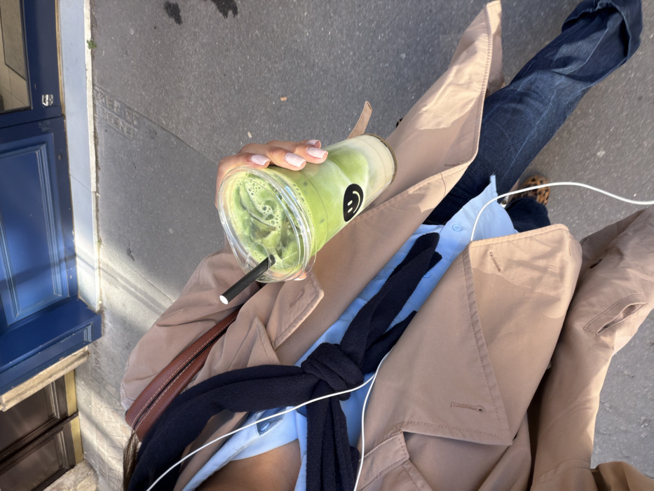 A high-angle view captures a person walking on a sunlit sidewalk in Paris, France. The individual wears a light tan trench coat over a light blue shirt, dark blue jeans, and leopard-print shoes. A dark blue sweater is tied around their shoulders, and white wired earphones are visible. The person holds a clear plastic cup in their right hand, showcasing light pink manicured nails. The cup contains a layered green and white iced beverage, featuring a black smiley face logo and a black straw. The immediate background consists of grey pavement and a partial view of a building with a dark blue door or frame, illuminated by strong sunlight casting distinct shadows.