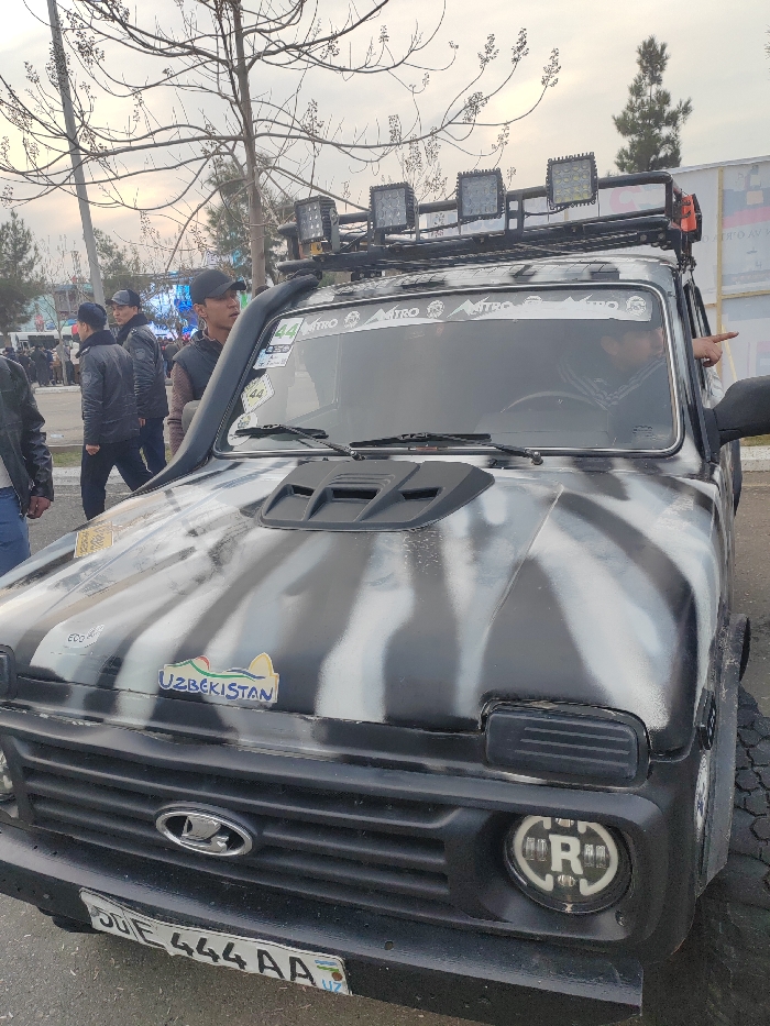 A modified black and white zebra-striped Lada Niva off-road vehicle is situated outdoors in Namangan City, Uzbekistan
