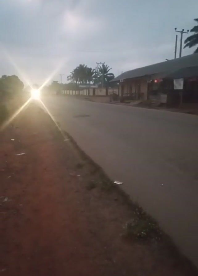 n asphalt road running between a dirt embankment and a building. The road appears to be mostly empty, with only a few pieces of trash on the surface. A bright light shines from the distance, apparently from an approaching vehicle. The sky is overcast. A voice can be heard saying “Wow, it’s coming. It’s coming. It’s coming.”