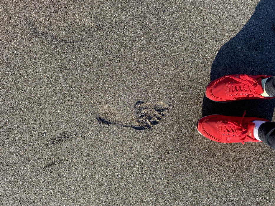 The image displays a ground-level view of dark grey, granular sand consistent with a beach environment in Donji Štoj, Montenegro. In the foreground, a person's feet are positioned, clad in dark trousers, white ankle socks, and bright red athletic shoes featuring white laces. Distinct shadows from the shoes extend towards the lower right of the frame, indicating illumination from the upper left. Directly in front of the viewer's right shoe and slightly to the left, a clearly defined bare human left footprint is impressed into the sand, exhibiting distinct toe and heel marks. A less distinct bare human right footprint is partially visible further in the upper right quadrant. A small, white, shell-like object is visible embedded in the sand in the upper left section. Faint, irregular linear disturbances are also present across the sand's surface.