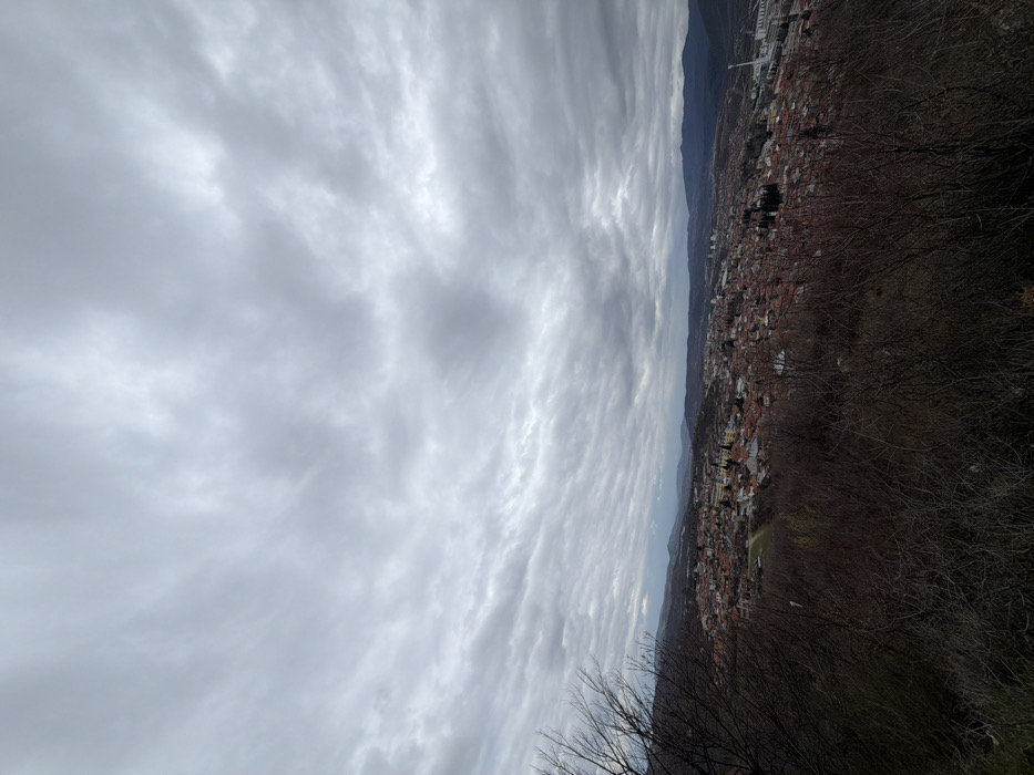 An elevated panoramic view captures the city of Sveti Konstantin, Bulgaria, under a uniformly overcast sky. The sky is dominated by dense, layered grey clouds extending across the entire upper half of the image. The immediate foreground shows a dark, barren hillside slope, densely populated with leafless trees and shrubs, indicative of late autumn or winter. Below this vegetation, the urban area of Sveti Konstantin spreads out, characterized by numerous buildings with predominant reddish-orange tiled roofs. Scattered throughout the city are various trees, some appearing as dark green conifers and others as bare deciduous species. In the mid-ground, a few taller, multi-story structures are discernible within the urban sprawl. The background features a series of distant, dark blue-grey rolling hills and mountains extending to the horizon. No individuals or specific activities are visible within the frame.