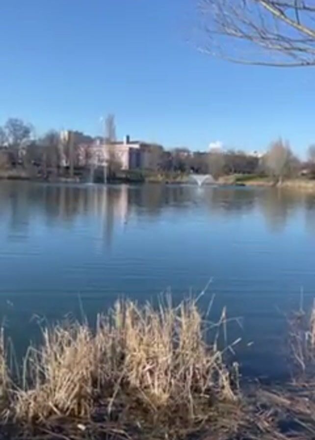 calm lake with two fountains spouting water in the distance under a clear blue sky