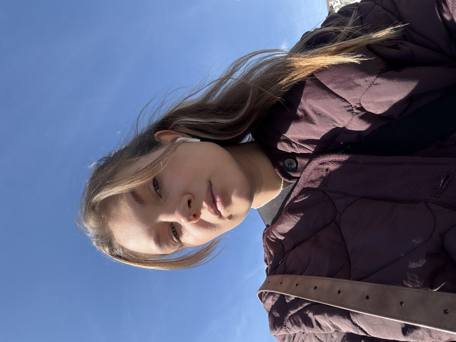 - "The image displays a young adult female captured from a low-angle perspective, consistent with a selfie, against a clear, bright blue sky" by FM-7mF7g2, licensed under CC BY 4.0