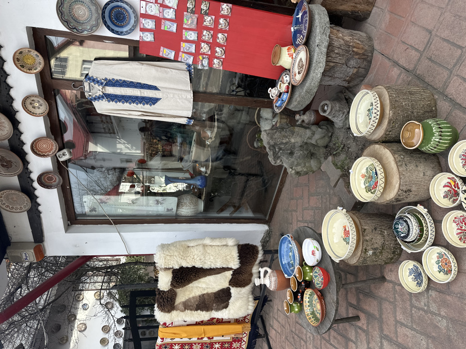The image depicts an outdoor market stall or shop entrance in Horezu, Romania, showcasing a variety of handcrafted items on a reddish-brown brick pavement