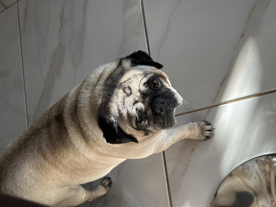 - "A fawn pug dog lies on a tiled floor, looking upwards with big, expressive eyes" by FM-kfGGA3, licensed under CC BY 4.0