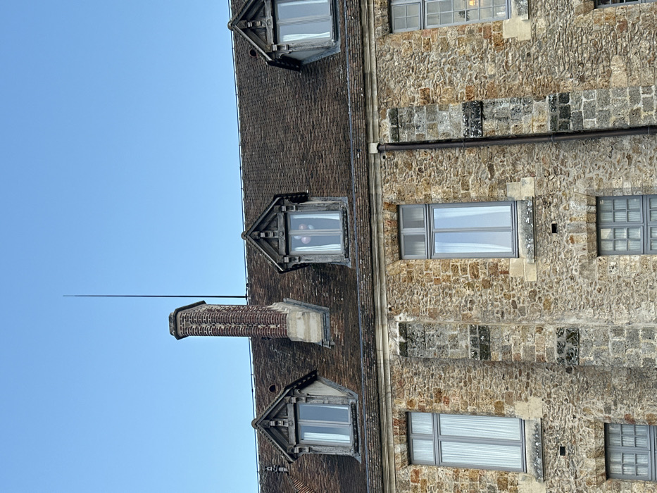 This image depicts the upper portion of a multi-story stone building located in Cernay-la-Ville, France, under a clear, light blue sky