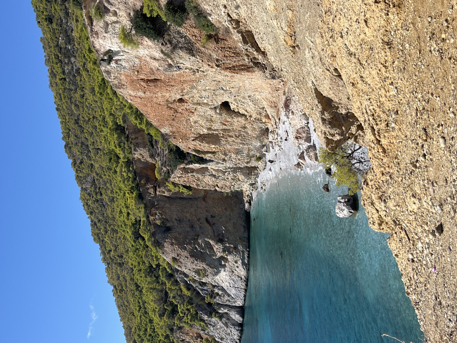 This image depicts a coastal scene near Skala, Greece. The environment consists of a clear, bright blue sky with a faint wisp of cloud on the far left. Below the sky, a steep, densely vegetated hillside with green evergreen trees descends from the top of the frame. Beneath the hillside, rugged cliffs form the coastline, displaying varied geological strata and colors, ranging from light gray on the left to reddish-orange on the right. The cliffs feature visible crevices, ledges with sparse vegetation, and at least one cave-like opening in the reddish-orange section. At the base of the cliffs, a narrow pebble beach with light-colored stones (white, gray, reddish) forms a crescent curve along the shore. The water adjacent to the beach is clear, exhibiting turquoise and deeper blue tones, with minimal surface disturbance. In the foreground on the right, a steep, dry, light brown and tan rocky slope, covered with loose scree, dominates the bottom portion of the frame. A small, dark-branched evergreen tree grows from this slope, extending towards the water. Two human figures are present on the pebble beach. One individual, dressed in dark clothing, is visible walking or standing in the central section of the beach. A second, lighter-colored figure appears to be lying on the beach further to the right, near the base of the cliffs. Scattered rocks and boulders are visible both on the beach and in the shallow water.