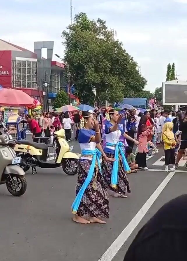 two dancers performing in the middle of a street, with a crowd of onlookers in the background. The dancers are barefoot and wearing traditional Indonesian outfits: blue and white tops, batik-patterned skirts, and light blue sashes. They are moving their arms and hands in a synchronized manner. The street is paved with asphalt and has white lane markings. There are motorcycles parked on the side of the road. The crowd is diverse, with people of different ages and wearing a variety of clothing. There are also vendors selling food and drinks. In the background, there are buildings, trees, and a large video screen. The sky is partly cloudy.