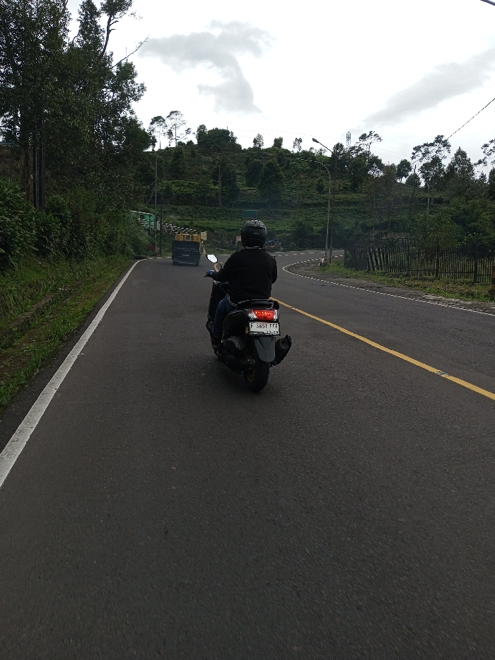 The scene is set in Adhanur, India, depicting a single individual operating a black motor scooter from a rear perspective on a paved road. The rider wears a black helmet, a black long-sleeved top, and dark pants. The scooter features a red taillight assembly and a license plate, "F 3651 FFF," mounted below. The road, an asphalt surface, has a solid white line on its left edge and a solid yellow line delineating the right side of the current lane, curving gently towards the right in the mid-ground. Further down the road, a dark-colored truck, possibly laden with crates, is observed moving in the same direction. The environment is characterized by dense green foliage and tall trees flanking both sides of the road, forming steep embankments and hillsides. Portions of the hills appear to be cultivated. An overhead streetlight is visible on the right side of the road, along with a dark fence. The sky is heavily overcast with significant cloud cover.