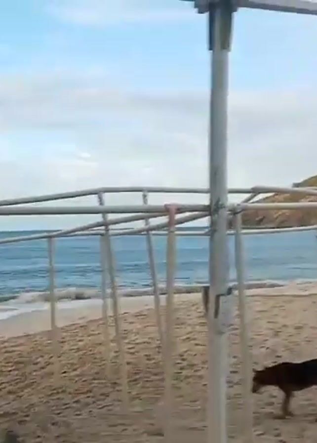 beach scene with a person lying on the sand near a tree. The beach has white sand and calm turquoise water. There are several white frames, likely for shade structures, placed on the beach. Some frames are covered with striped awnings. People are sitting at tables under the shaded areas. A rainbow is visible in the sky. A dog walks near the camera. The camera moves, showing a wider view of the beach, trees, and a building.