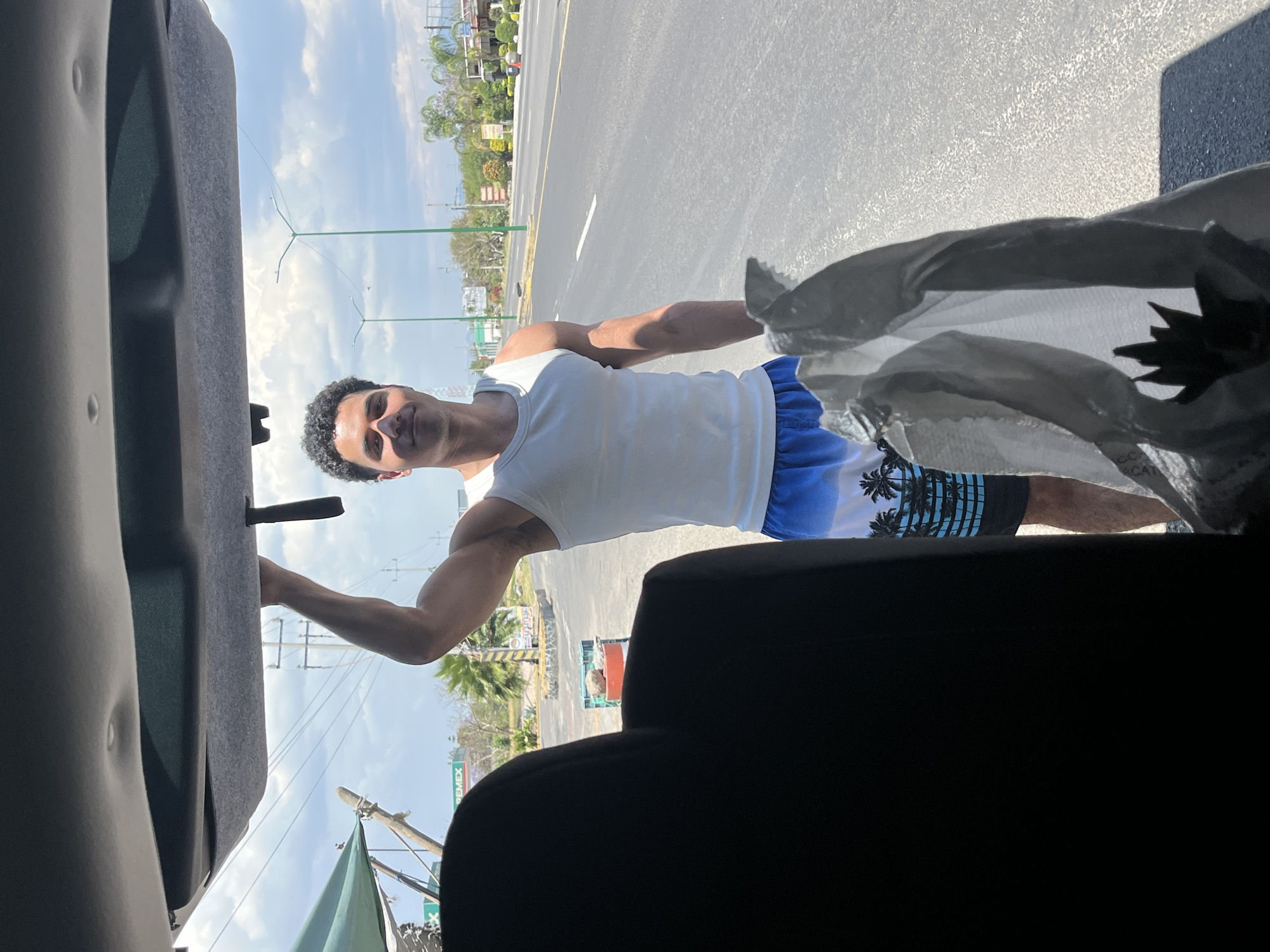 A man stands outside the open hatch of a vehicle on a street in San Juan Huiluco, Mexico. He faces the camera with a slight smile, wearing a white tank top and blue and black patterned swim trunks. The open hatch door is to his left, while a partially visible white plastic bag is to his right. The background features a street with buildings, trees, and power lines under a partly cloudy sky. A black car seat is visible in the foreground.