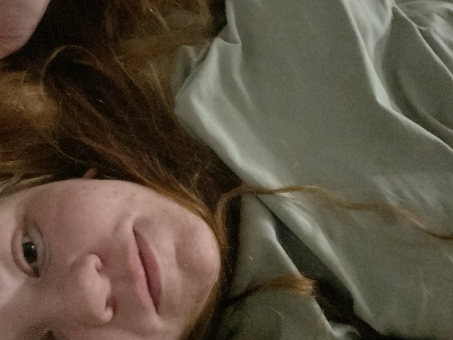 A close-up, angled view shows a person lying down, their face partially visible. They have fair skin, freckles, and reddish-brown hair. Their eye is open, and they are looking towards the camera. Next to the person is a light green or grey fabric, likely a blanket or bedsheet. The lighting is soft and muted, suggesting an indoor setting. The composition is off-center, with the face occupying the lower left corner of the frame.