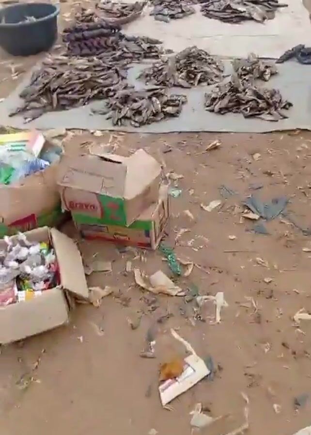 market scene with dried fish laid out for sale on a grey cloth spread on the ground. Several piles of dried fish are visible. A black bucket contains more dried fish. The ground is dirt and littered with trash including plastic wrappers and cardboard. People are present, seen in the background. Someone is holding a clear plastic bag. The video is shaky.