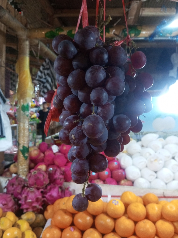 The image presents a close-up, eye-level view within a fruit market in Cipanas, Indonesia. A large, dark purple bunch of grapes, tied with red string, hangs prominently in the central and right foreground. Individual grapes are visible, exhibiting a consistent deep purple coloration. In the midground, various fruits are displayed on tables or shelves. To the left, several magenta-colored dragon fruits are visible. Behind them, numerous red apples are stacked. To the lower right, a large quantity of bright orange citrus fruits, possibly oranges, are arranged in rows. Further to the right and slightly elevated, a mass of uniformly white, spherical or wrapped objects is discernible. The background is out of focus, revealing structural elements of a market stall, including bamboo poles in the upper left. A yellow fabric item hangs vertically on the left. A blurred figure, possibly a person in a dark shirt, is visible in the distant left background. The scene is lit by ambient light, with a bright, undefined light source creating a glare in the upper right quadrant.