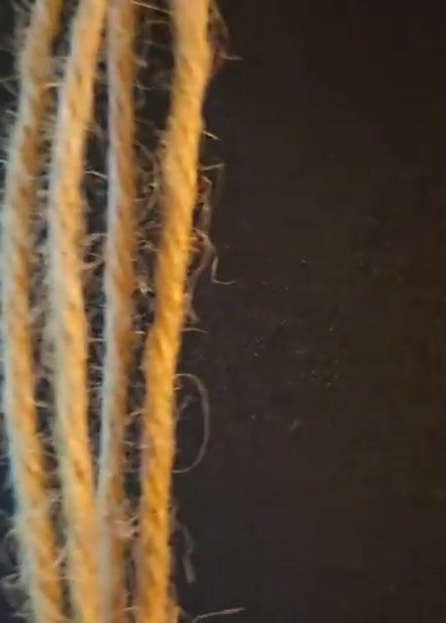 four strands of natural fiber rope against a black background. The camera focuses closely on the rope, showing its texture. The strands appear slightly frayed.