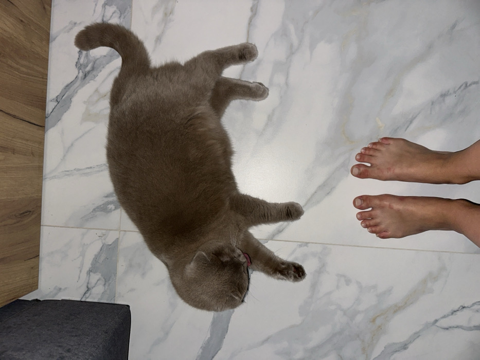 The image displays an indoor scene in Shevchenkove, Ukraine, captured from an overhead perspective. A light brown Scottish Fold cat, distinguished by its folded ears, is centrally positioned on a white tiled floor with grey marble-like veining. The cat is oriented horizontally, facing left, with its head lowered and its tongue extended to lick its left foreleg. A narrow pink collar is visible around its neck. Directly below the cat, occupying the lower portion of the frame, are two bare human feet, positioned flat on the tiles with toes pointing towards the top of the image. In the upper left background, a dark grey upholstered surface is visible, while a light brown wooden surface is present in the upper right background.