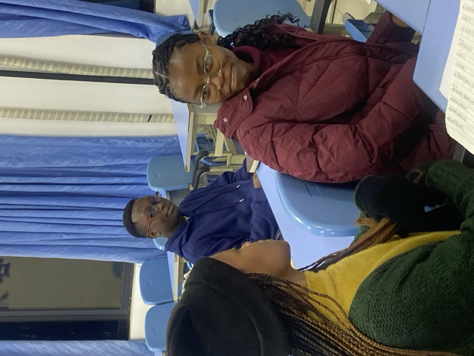 Three students are seated in a classroom. A woman with glasses and a maroon coat smiles at the camera. Behind her, a man with glasses wears a blue hoodie. In the foreground, a student with a black hoodie, a yellow shirt, and green sweater, faces the others. Blue chairs and a window with blue curtains are visible. There are also some papers on the table.