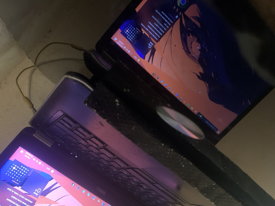two laptops stacked on top of each other with a black riser in between. The bottom laptop is a Dell, displaying a calendar and software development-related text, indicating languages and frameworks such as Javascript, React, Three.js, and GSAP. The top laptop has a chrome icon and a partially visible wallpaper with an illustration. The surroundings are dimly lit, highlighting the screens of both devices. Cables are connected to the sides of the laptops.