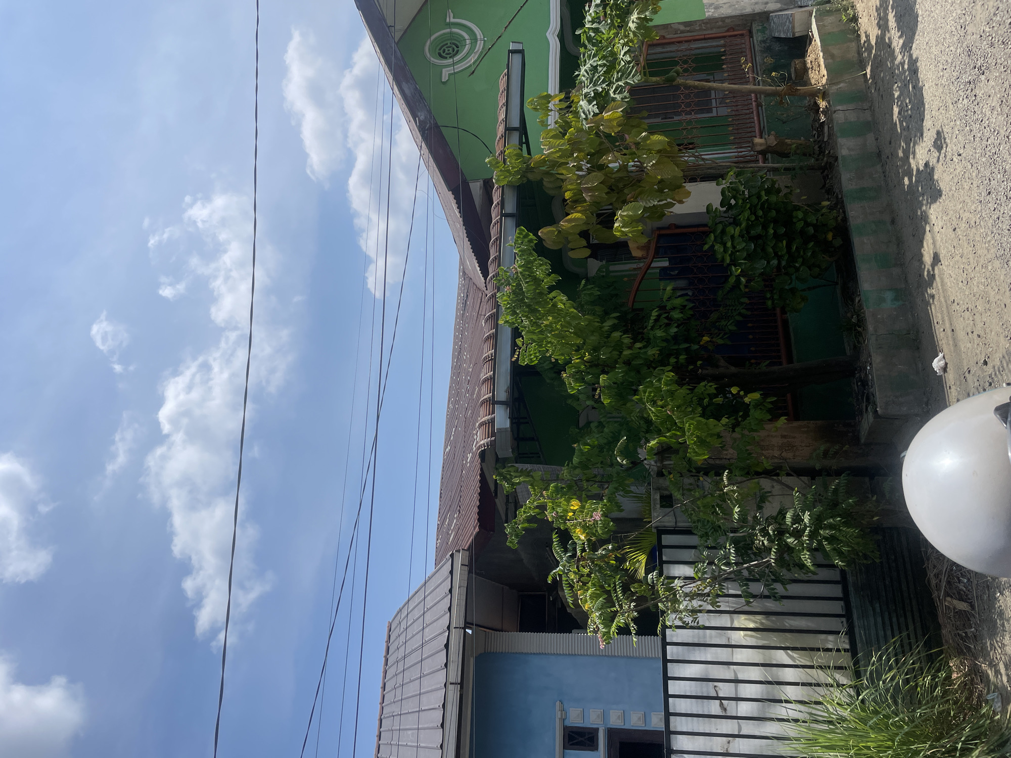 The image depicts a residential street scene in Langsa, Indonesia, under a clear blue sky with scattered white cumulus clouds