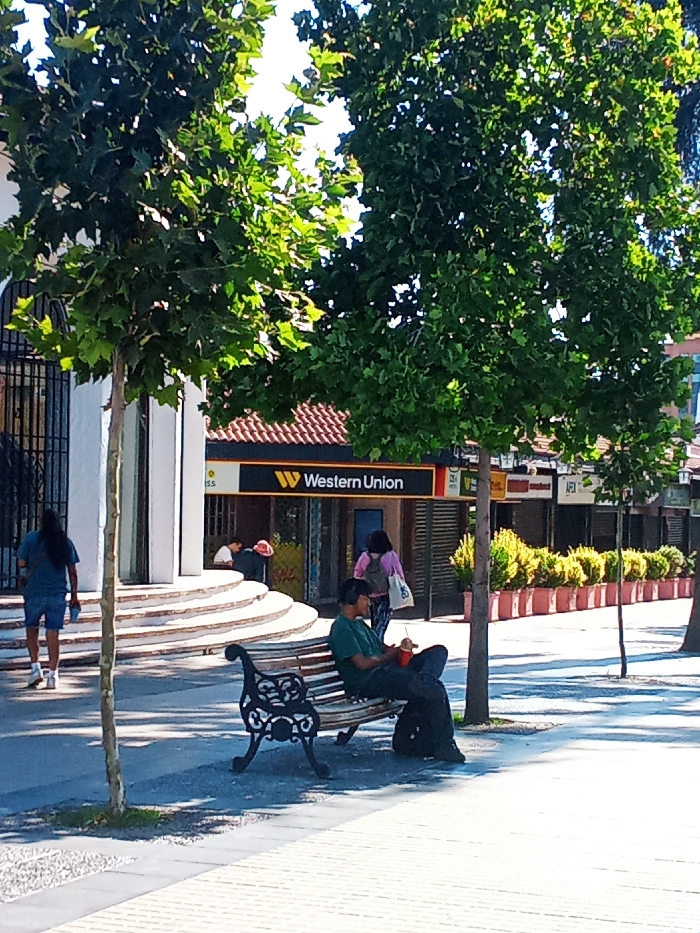 A sunny street scene shows people engaged in various activities. A man sits on an ornate bench, holding a drink. Nearby, a woman walks towards a Western Union storefront, while another man walks away from a building with steps. A row of plants lines the street further down. Trees with lush green leaves provide partial shade.