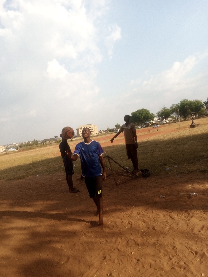 Three individuals stand on a grassy field under a partially cloudy sky. One person holds a basketball. Another, wearing a light brown t-shirt, points towards the distance. A collapsed soccer goal lies nearby. The foreground shows sandy soil with the shadows of the people. In the background, a building is visible along with trees and part of a neighborhood.