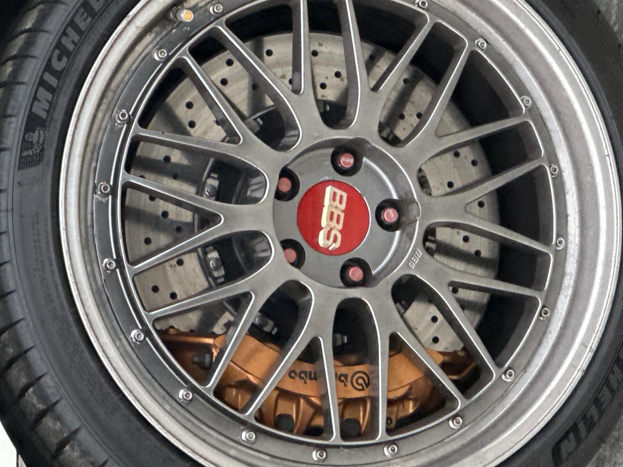 close-up of a car wheel. The tire is a Michelin brand. The wheel has a silver multi-spoke design with a red BBS logo in the center. Behind the wheel, a perforated brake rotor and a gold Brembo brake caliper are visible. The environment is not specified, so I cannot confirm that it is from the city of London in the United Kingdom.