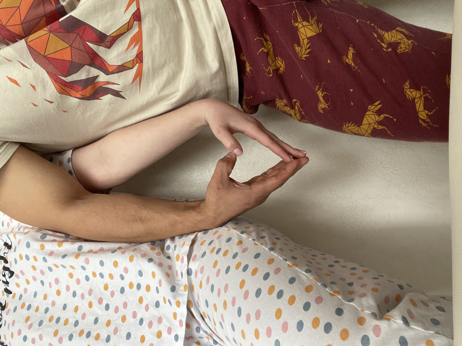 Two individuals are depicted in a close-up, waist-to-mid-thigh view, standing against a plain, light-colored wall. The individual on the left wears white pajamas patterned with scattered pink, orange, and blue polka dots, with partial dark text reading "the right" visible on the upper garment. This individual's right arm, exhibiting a darker skin tone, is held alongside the body. The individual on the right wears a light beige t-shirt featuring a large, stylized geometric horse design in shades of orange, red, and brown. This individual also wears maroon pajama bottoms patterned with repeating golden geometric horses. The right individual's left arm, exhibiting a lighter skin tone, is held alongside the body. The hands of both individuals are clasped together at the center to form a heart shape. The left individual's right hand forms the left half of the heart, and the right individual's left hand forms the right half. The forearms of both individuals touch along their inner surfaces. The lower edge of the image shows a transition to a lighter surface, possibly a floor or low platform.