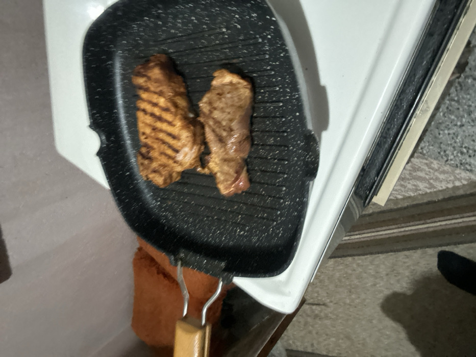 This image depicts an indoor kitchen scene, specifically within a residence in Aytos, Bulgaria. The central focus is a black, rectangular grill pan with a speckled non-stick surface and a wooden handle. Two pieces of meat, consistent with beef steaks, are positioned within the pan. The upper steak exhibits well-defined, dark grill marks and an overall reddish-brown seared appearance. The lower steak shows less pronounced grill marks and a lighter, moister reddish-brown color, indicating varying stages of cooking. The grill pan rests on a white, flat kitchen appliance surface, likely an electric stove or cooktop. In the upper left background, a plain, light-colored wall is visible, behind which an orange, soft textile object, possibly a towel or cloth, is partially seen. The lower left foreground features a striped floor covering, resembling a rug or mat with varying shades of brown and beige. A dark, distinct shadow, consistent with a human leg and foot, is cast upon this floor covering, indicating the presence of the photographer. No individuals are directly visible. The environment appears to be an active cooking area.