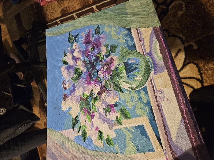 The image presents a rectangular canvas painting depicting a still life. The painting features a bouquet of white and purple lilac flowers with green leaves, arranged in a translucent green vase, resting on a light brown windowsill. Behind the vase, a window shows a light blue sky and abstract green and blue elements, flanked by light green curtains. The painting is oriented in landscape format and positioned at an incline, partially obscuring a brown patterned rug in the lower right. In the upper background, a dark-clad human leg, part of a black office chair with wheels, and indistinct dark objects are visible. This scene is located in Dimitrovgrad, Bulgaria.