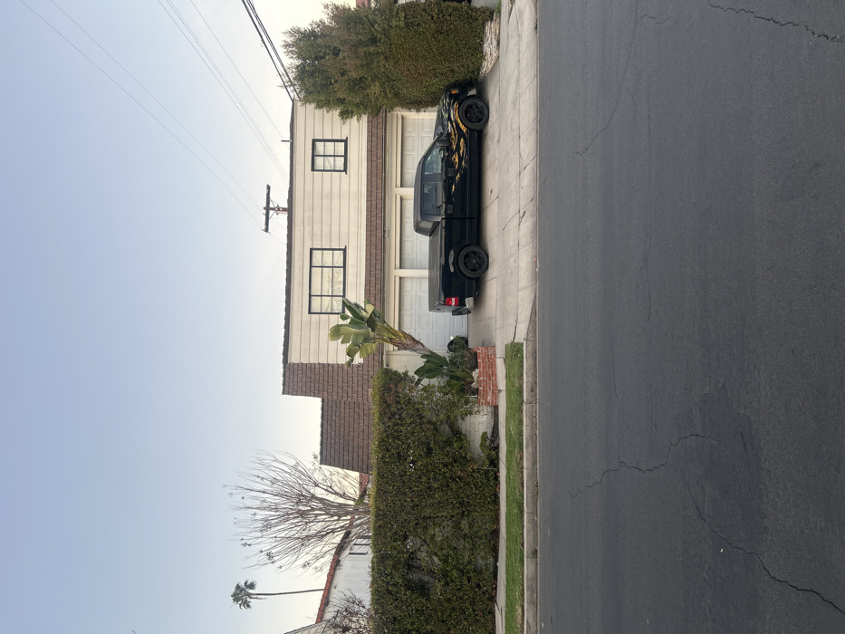 A black pickup truck, adorned with flame decals, is parked in a driveway next to a two-story house with white siding and brown roof. The house has a double garage and two visible windows on the second floor. A lush green hedge runs along the property line, and a palm tree stands near the driveway entrance. Power lines stretch across the pale sky. The road is cracked and black.