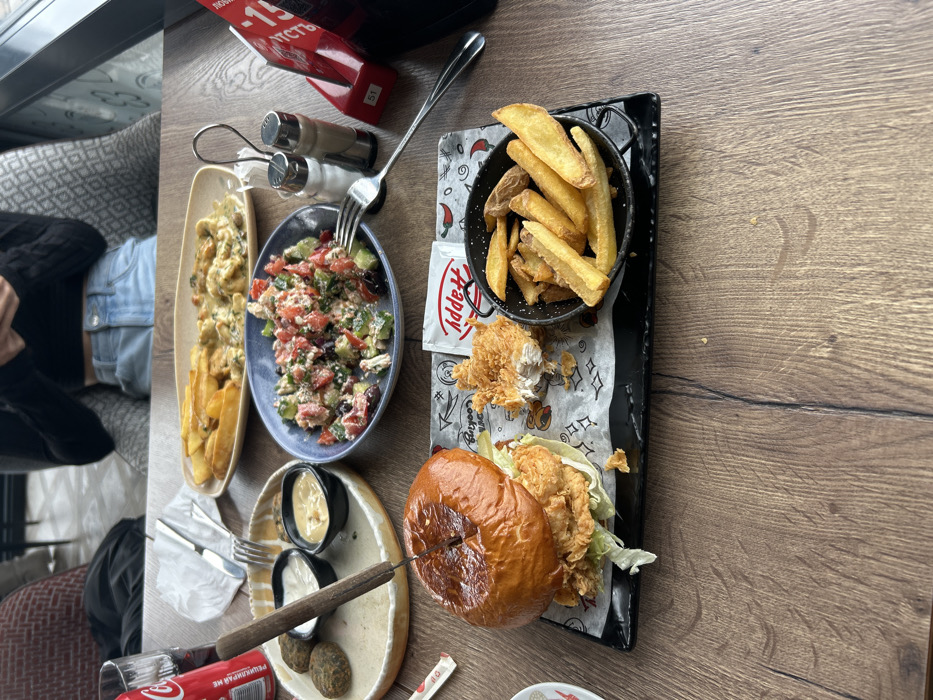 The image depicts a dining scene inside a Happy Bar & Grill restaurant in Varna, Bulgaria. The setting is a wooden-surface table with various food items and tableware. In the foreground, a large fried chicken burger with lettuce on a toasted bun is impaled with a knife and rests on black rectangular stoneware, lined with patterned paper. Adjacent to it, a small black bowl contains golden-brown potato wedges. A torn piece of fried chicken, likely from the burger, lies on the paper next to a white sachet labeled "Happy" with red lettering, indicating ketchup. To the left, a light-colored round plate holds three fried, round patties (resembling falafel) and two small white dipping bowls containing sauces (one light-colored, one light brown). A Coca-Cola glass with red branding is positioned further left. In the mid-ground, a blue bowl contains a chopped salad composed of tomatoes, cucumbers, olives, and white cheese. A silver fork rests next to this bowl. A set of salt and pepper shakers is visible, along with a red table sign with partially visible Cyrillic text, including "ЦЕНТЪР" (Center), and the number "51". Further back, a beige rectangular plate holds more potato wedges and a creamy, light-colored dish, possibly a gratin or chicken with sauce. In the background, a person is seated at a table, partially visible from the chest down. They are wearing a black long-sleeved top and light blue jeans. Their hands are clasped, holding a smartphone, suggesting interaction with the device. The background elements are blurred, showing restaurant seating with patterned upholstery and natural light from a window.