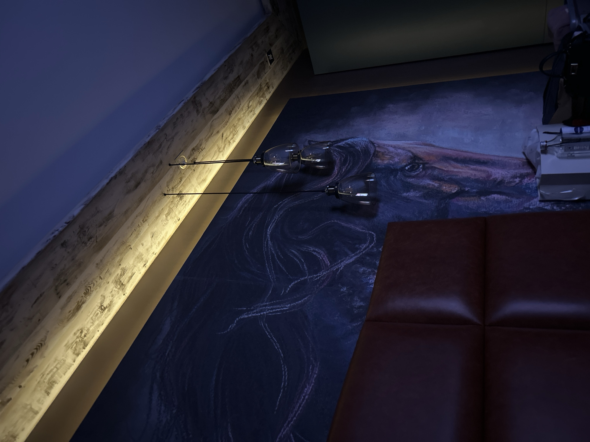 A dimly lit, low-angle shot reveals a room interior. The focal point is a wall adorned with a dark, possibly painted, mural depicting a horse's head and mane in shades of purple and blue. A three-bulb light fixture is attached to a wooden beam running diagonally down the left side of the frame. A section of what appears to be a padded, brown leather headboard or wall panel is visible in the lower right corner. A desk is in the background on top of which are objects including a lamp and bag. There is no information in the photograph to identify the location as Brestnik, Bulgaria.