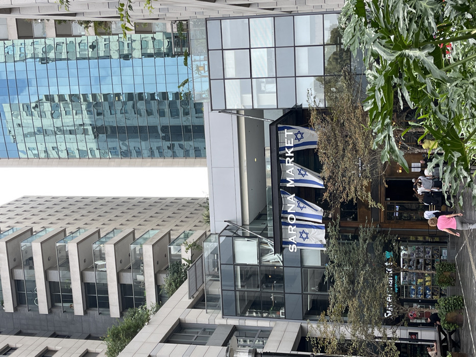 The image depicts the Sarona Market complex in Tel Aviv, Israel, viewed from a pedestrian area