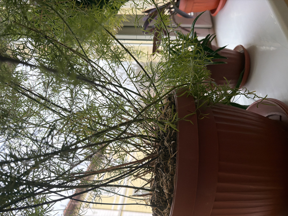 The scene depicts an interior view looking out through a window in Veliko Tarnovo, Bulgaria. A large potted Asparagus fern, characterized by numerous thin, green, needle-like foliage and brown stems, occupies the immediate foreground. This plant is housed in a ribbed, reddish-brown plastic pot with a matching saucer, positioned on a white windowsill. The soil in the pot appears dry, with some roots visible on the surface. To the right on the same windowsill, two additional potted plants are present. One is a smaller plant with succulent-like green leaves, contained within a ribbed reddish-brown plastic pot and saucer. Further to the right, another plant with darker-toned leaves is visible in an orange-brown pot, also with a saucer. Through the window, partially obscured by the foreground foliage, an exterior building is visible under an overcast sky. This building is light-colored, consistent with yellow or cream, and features dark-framed windows. No human figures are present in the depicted environment.