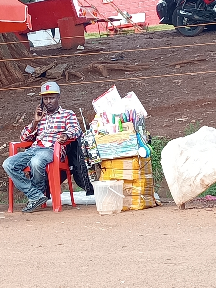 A man wearing a baseball cap, plaid shirt, and jeans sits on a red plastic chair, talking on a cell phone. Next to him sits a pile of merchandise, including notebooks, pens, and other small items, strapped together. A clear plastic bucket is placed in front of the pile. A black jacket hangs on the back of the chair. A white bag sits to the right of the pile, and a blurred motorcycle and other structures are in the background.