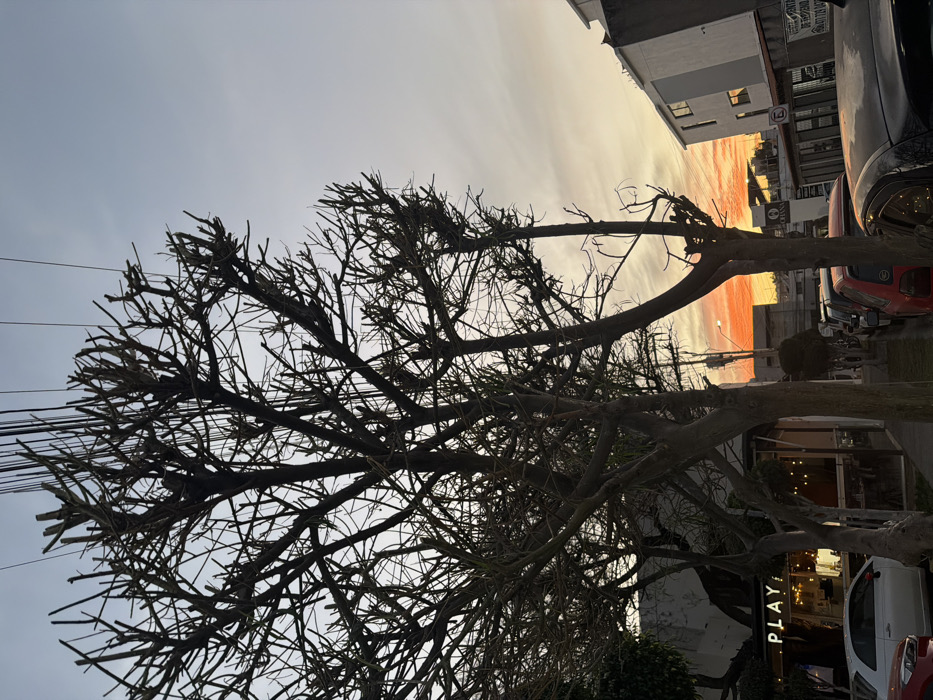 A bare tree with intricate branches dominates the foreground against a muted sky. In the background, a building and parked cars suggest an urban setting. The sky displays shades of orange and gray, hinting at either sunrise or sunset. The overall impression is one of stillness and muted color, capturing a moment in a city landscape.
