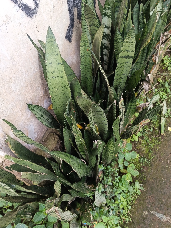 - "A dense cluster of snake plants grows beside a weathered wall with traces of graffiti" by FM-cc7582, licensed under CC BY 4.0